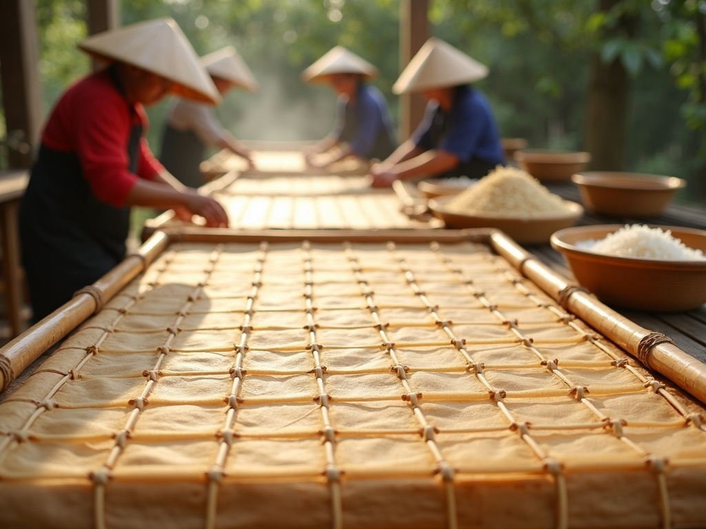 The authentic production method starts with soaking rice overnight, then grinding it into rice milk. I’ve observed that this time-intensive process creates a smoother, more refined texture than rushed commercial methods. Artisans steam this rice milk mixture into thin sheets before transferring them to woven bamboo racks for sun-drying.